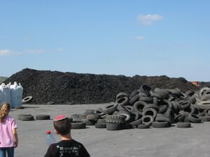 Used tires in the foreground, waiting to be shredded. A pile of shredded tires in the background.