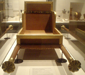 The wood of the palanquin (JE 52372) is even better preserved than that of the bed, although it has shrunk to about one-sixth of its original volume. It is 99 cm long, 53.5 cm wide and 52 cm high. The wooden construction was gilded at all corners and decorated with geometric reliefs. The seat could be pulled out to allow the queen to stretch her legs. On both sides of the backrest, at the height of the armrests, was the following inscription in gold hieroglyphics on black ebony: "Mother of the King of Upper and Lower Egypt, daughter of Horus, entrusted with the affairs of Imat, the one for whom the word was created, daughter of God, Hetepheres".[16] The wooden construction was held together with leather straps and copper-coated pegs. Palm-shaped finials were attached to the ends of the supporting poles.[17]
