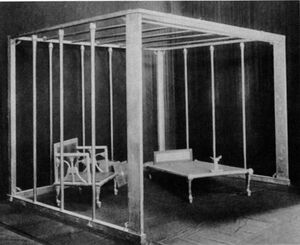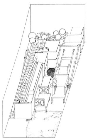 On March 12, Reisner ordered the chamber closed again until he returned to Egypt. It was not reopened until January 21, 1926, under his direction. Over 321 working days, the young Dows Dunham, in particular, meticulously recorded every object. The work was dangerous: a stone fell from the ceiling of the chamber and Dunham escaped unharmed only because he was wearing a helmet.[3] In addition to Reisner and Dunham, Noel Wheeler was also involved in emptying the chamber. This work resulted in a total of 1,701 manuscript pages of plans and notes and 1,057 photographs. This made it possible to determine the original position of the disintegrated objects and also to reconstruct the arrangement of all the tomb furnishings. Although reconstructions of fragments are part of the daily work of archaeologists and many Egyptologists, this reconstruction is a particularly outstanding achievement.[4]