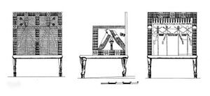 The dismantled parts of a gilded wooden frame of a baldachin (JE 57711) lay partly on the sarcophagus and partly between the coffin and the east wall. As the wood rotted, the gold coating fell onto the pottery in this area. The box for the canopy (JE 72030) stood on the western edge of the coffin lid and disintegrated in situ.[18] However, the inlaid decoration was found intact and in its original arrangement, allowing the reconstruction of the facade. Each of the long sides bears an inscription, separated into two mirror-image parts by two representations of the vulture goddess Nekhbet.[19] The canopy could be disassembled relatively quickly and reassembled at another location by inserting the poles through the copper-plated pegs into the copper recesses. Hangers were attached to the top of the frame at regular intervals on all four sides, apparently for attaching curtains to the inside of the canopy and a cloth to cover them. No remains of the curtains were found. It is possible that they were originally stored in the box. The canopy must have formed a space in which the bed and perhaps other furniture were placed, perhaps for privacy or protection from insects. The gold casing was mainly decorated with mat patterns, except for the smooth surface of the bars and the inside of the door frame, which were inscribed with the title and name of Snofru.[20]