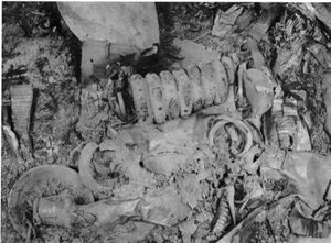 At a depth of 7.47 m, a 2.10 m high and 1.67 m deep niche was reached in the west wall. This closed off a 92 cm × 67 cm area containing a horned skull and three bull leg bones wrapped in a decaying reed mat. In addition, there were two wine jars and a limestone, which Rowe believes was used for the ritual breaking of the bull's skull, a piece of silver, and some fragments of basalt and charcoal.[8] These form an offering associated with the introduction of the grave goods.[9]