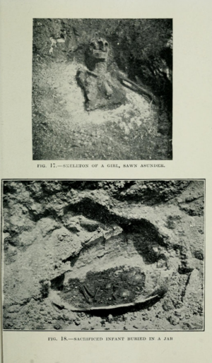 Archaeologists have applied the term "tophet" to large cemeteries of children found at Carthaginian sites that have traditionally been believed to house sacrificed human children, as described by Hellenistic and biblical sources. This interpretation is controversial: some scholars argue that the tophets may have been children's cemeteries and reject Hellenistic sources as anti-Carthaginian propaganda.[1] Others argue that not all burials in the tophet were sacrifices.