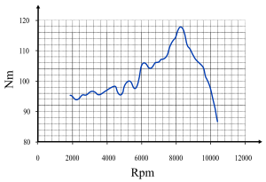 Torque curve of a motorcycle ("BMW K 1200 R 2005"). The horizontal axis shows the rotational speed (in rpm) that the crankshaft is turning, and the vertical axis is the torque (in newton-metres) that the engine is capable of providing at that speed.