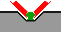 Left: diagram of the Translohr guide rail (green) and the tram's guide wheels (red). Right: cross section of the guide rail and guide wheel of the Bombardier's GLT