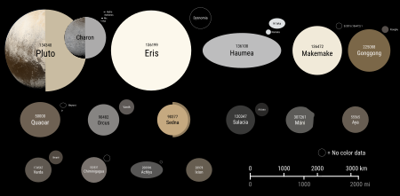 | 136199 إريس | كوكب قزم، جرم قرص متفرق، وحالياً، أكبر جرم معروف بعد نپتون. له ساتل واحد معروف، ديسنوميا. |