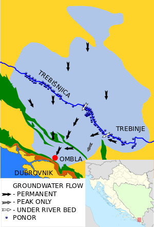 The first, at the head of the river and at the outskirts of Bileća town, is the Trebišnjica wellsprings group, consisting of three large wellsprings, with Dejanova Pećina as primer outflow, and two secondary ones, wellspring Oko and Nikšičko Vrelo.[3][4]