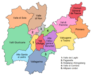 The majority of the Trentino population is Italian-speaking with its local dialects. The region is also home to three indigenous linguistic minorities, which are Ladin, Mócheno and Cimbrian.[23] All languages are protected by regional and provincial laws, statutes, and regulations.