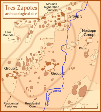 تريس زاپوتس Tres Zapotes هو موقع أثري بوسط أمريكا يقع في جنوب-وسط منخفضات الخليج بالمكسيك في سهل نهر پاپالواپان. Tres Zapotes is sometimes referred to as the third major Olmec capital (after San Lorenzo Tenochtitlán and La Venta), but the Olmec phase is only a portion of the site's history,[1] which continued through the Epi-Olmec and Classic Veracruz cultural periods.