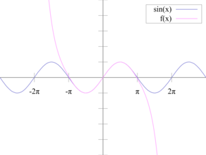 The sine function (blue) is closely approximated by its Taylor polynomial of degree 7 (pink) for a full cycle centered on the origin.
