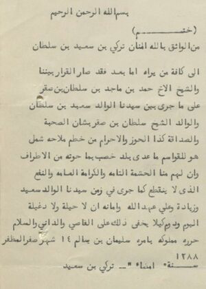 وصلني خطابكم الكريم الموقر، وسرني ما أنتم عليه من الصحة. لقد فهمت بوضوح ما عبرتم عنه وطبيعة الظروف المؤسفة التي شاء الله أن تقع، ممثلة في الموجهة التي جرت بين الشيخ صالح بن محمد وسفينتكم. وقد زار صالح ـ كما ذكرتم عن حق ـ دار المقيم في أبوشهر وطلب امداده بالبارود وقذائف المدافع، لكن دون سوء قصد. وقد هوجمت سفينتكم أولاً بمركب تابع لعرب صحار، ومعه مراكب أخرى في صحبة صالح، أن اشتباك خسروا فيه كثيراً وفقدوا بهض رجالهم. وأراد صالح أن يوقف القتال ويفصل بين المتحاربين، فاقترب بمركبه من سفينتكم وتلقى طلقات من قذائف المدافع ونيران البنادق. هذه هي الوقائع التي حدثت. ومعاذالله أن يخالج صالح قريبنا سوء قصد نحو أصدقائنا. ومن الواضح أنه لو كان لديه سوء نية نحو سفينتكم ر لجاز اتهامه بسلوك غير ىئق حين زيارته للوكالة. ولو اتهموه بذلك عن عدل وانصاف لكان مذنباً. لسنا في نزاع أبداً مع الإنجليز، فهم أصدقاؤنا، بينمااعداؤنا هم أهل عمان، وكما وضحنا لكم، فاننا نكن لكم من مشاعر الصداقة، ولن نصيبكم بضرر، ولا نود أن يصيبكم غيرنا بضرر، وسوف نقدم لكم كل ما في وسعنا من خير، لاأرى أذى على الإطلاق. حين تسلمت خطابكم، بعثت بأوامر ومراكب لاحضار صالح أمامي. ونحن على استعداد للقيام بأية تسوية عادلة لائقة عن الحادثة التي وقعت، بل ما هو أهم منها، ان لكم عندنا وعند جميع عرب الخليج من حسن السمعة ما هو معروف مستفيض، ويجب أن تلقى رغباتكم ما ينبغي من التنفيذ، وان شاءالله ستنمو صداقتنا وتزدهر، ولك أن تثق تماماً بصداقتنا لك، وسنعبر عنها بالقول والفعل.. متعكم الله بالصحة والعافية. |