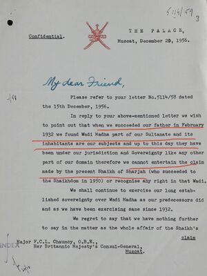 وبحسب الوثائق المختلفة فإن مشكلة حدود وادي مدحاء كانت ستختفي لو وافق أن قابوس على عرض شيخ الفجيرة حينها بالإنصمام إلى السلطنة قبل إتحاد الإمارات، مقابل تكفل السلطنة بتكاليف المستشفيات والمدارس وتوليد الكهرباء وغيرها -وهو عرض نبيل- لكن قابوس رفض العرض بمشورة الإنگليز.