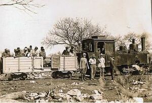 Otavi Mining and Railway Company train near Tsumeb about 1931. The photograph must have been taken in winter, as the trees have no leaves. Despite the fact that Tsumeb is in the tropics, it is well over a thousand metres above sea level and frosty in winter.