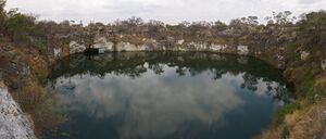 Near the town are two large sinkhole lakes, Lake Otjikoto and Lake Guinas ("Gwee-nus"). Guinas, at about 500 m in diameter, is somewhat larger in area than Otjikoto. A pioneering documentary movie about scuba diving in these lakes was made by Graham Ferreira in the early 1970s. The depths of the lakes are unknown, because towards the bottom both lakes disappear into lateral cave systems, so it is not possible to use a weight to sound them. Otjikoto, which has poor visibility (owing to pollution from agricultural fertilizers used nearby), is at least 60 m deep. The water in Guinas is completely clear and well over 100 m deep. Divers who have performed bounce-dives in Guinas to 80 m (strictly speaking, beyond the safe depth for such dives, especially given the altitude of the lake above sea level) have reported that there was nothing but powdery-blue water below them. Guinas has been in existence for so long that a unique species of fish, Tilapia guinasana, has evolved in its waters.