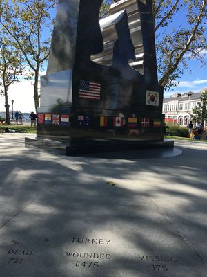 Overall losses for the Turkish Brigade in Korea was 721 killed in action, 2,111 wounded and 168 missing.[5] Among the losses is the lone Turkish pilot, Muzaffer Erdönmez, who piloted a US B-26 and was shot down over Wonch Ang-nı while bombing the railroad tracks.[10] A total of 14,936 men served in the brigade between 1950–1953[1] with about 5,455 soldiers in Korea at any one time.[11] The United Nations Memorial Cemetery in Busan, South Korea is the burial place for 462 of those casualties.[12] Two memorials to the Turkish soldiers are at the cemetery.[13][14]