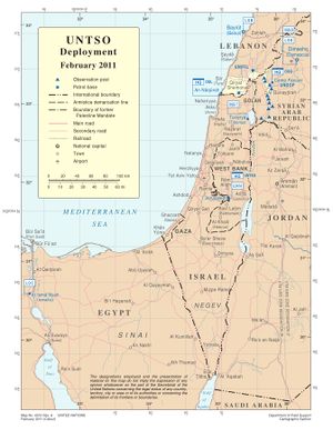 هيئة الأمم المتحدة لمراقبة الهدنة United Nations Truce Supervision Organization (UNTSO) هي هيئة تأسست في 29 مايو 1948[1][2][3] for peacekeeping in the Middle East. Its primary task was providing the military command structure to the peace keeping forces in the Middle East to enable the peace keepers to observe and maintain the cease-fire, and as may be necessary in assisting the parties to the Armistice Agreements in the supervision of the application and observance of the terms of those Agreements.[3] The command structure of the UNTSO was maintained to cover the later peace keeper organisations of the United Nations Disengagement Observer Force (UNDOF) and the United Nations Interim Force in Lebanon (UNIFIL).