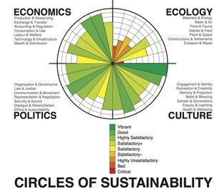 In 2007, the Secretariat moved from the Committee For Melbourne to the Global Cities Institute at RMIT University, itself affiliated with UN-HABITAT. There, projects associated with city-based responses to global climate change and globalization became increasingly important. The Melbourne Model was further elaborated, with a sustainability indicators program developed as a way of assessing and monitoring progress.[17] In 2012, the Circles of Sustainability method was elaborated to guide a city or urban region through a rigorous assessment process. As one of the outcomes it provides a figurative image of the overall sustainability of that city to illustrate its strengths and weaknesses.