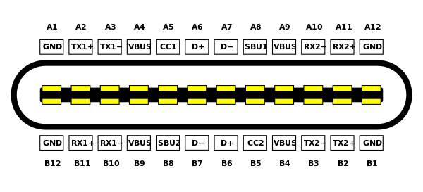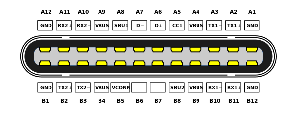 | GND | TX1+ | TX1− | VBUS | CC1 | D+ | D− | SBU1 | VBUS | RX2− | RX2+ | GND |