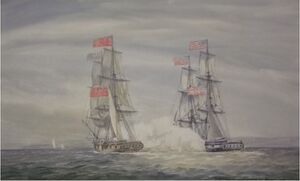 At sea when war was declared on Britain, she cruised along the east coast during the first year of hostilities. On 5 September 1813, Enterprise sighted and chased the brig Boxer. The brigs opened fire on each other, and in a closely fought, fierce, and gallant action which claimed the lives of both commanding officers, Enterprise captured Boxer and, under the guidance of her new captain Samuel Drinkwater,[44] took her into nearby Portland, Maine, where commandant Edward McCall oversaw a joint funeral for Lieutenant William Burrows of Enterprise, and Captain Samuel Blyth of Boxer, both well-known and highly regarded in their respective naval services.[45] Both Burrows and Blyth were buried in the Eastern Cemetery in Portland, near the grave of Commodore Edward Preble.