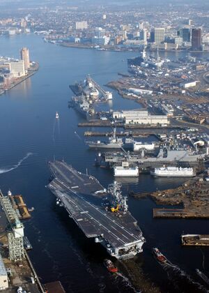 On 28 February, the aircraft carrier began her dry-docking PIA maintenance and yard overhaul period at NNSY in Portsmouth (pictured).[38] During this maintenance cycle, Harry S. Truman received a new main mast, an upgrade in her close-in weapons systems, and the installation of the automated digital network system, which provides the carrier with enhanced communications and cooperative engagement capabilities to assess possible threats.[39] Harry S. Truman was expected to complete this DPIA yard overhaul in early 2012 and begin preparations for her sixth overseas deployment.[40] Also, her berthing spaces were also upgraded, installing 2,500 racks, replacing 46,000 square feet of deck and painting 106,000 square feet of spaces.[41]