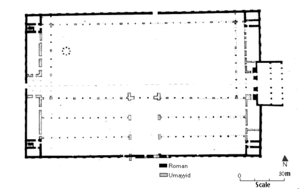 وكان المكان وإثر زلزال عنيف أتى على المعبد جوبيتر وبقي الهيكل ناوس الذي يقع في منتصف فناء واسع محاط بجدار مرتفع تخترقه أربعة أبواب من الجهات الأربعة ، وكان يحيطها سور آخر معمد بالاعمدة ولقد استعمل المسيحيون من سكان دمشق هذا الهيكل كنيسة ، وكانوا يدخلون من الباب ذاته الذي أصبح يدخل منه المسلمون إلى مسجدهم في الشرق .