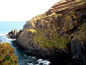 Cliff at the east of Siccar Point in Berwickshire, showing the near-horizontal red sandstone layers above vertically tilted greywacke rocks.