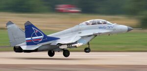 In February 2007, the UAC presented its first aircraft and the first military aircraft designed and exported under the UAC brand, the Mikoyan MiG-35, designated by NATO as "Fulcrum-F" and a Generation 4++ jet fighter by Mikoyan.[14] The MiG-35 was officially presented during the Aero India 2007 air show in Bangalore, India and officially unveiled when the Russian Minister of Defense, Sergei Ivanov, visited the Lukhovitsky Machine Building Plant "MAPO-MIG".[15] The MiG-35 was a contender for its fourth generation counterparts in the Indian MRCA competition but was taken out of the competition in April 2011.[16] The MiG-35 would be adopted by the Russian Air Force and was planned to be introduced in 2018.[14]