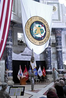General Ray Odierno of the U.S. Army salutes the newly unfurled USF–I flag during the command's activation ceremony in January 2010.