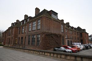Other early buildings include the Cohen Building, which originally housed the college library, and Staff House, now named Canham Turner building, built in 1948 as the Students' Union. Another early structure was the Chemistry Building, built in 1953. With the rapid expansion of student numbers which took place in the 1950s many academic departments were housed in temporary buildings, colloquially known as 'huts', which gave the campus the feel of an 'academic army camp'.[7][8] The Dennison Centre on Cottingham Road was formerly the Brooklands Officers Hospital opened by the Red Cross in 1917.[9] The author J. R. R. Tolkien was a convalescent patient at Brooklands and his connection is marked by a blue plaque.[10]