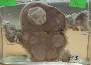 Fibroids are a type of uterine leiomyoma. Fibroids grossly appear as round, well circumscribed (but not encapsulated), solid nodules that are white or tan, and show whorled appearance on histological section. The size varies, from microscopic to lesions of considerable size. Typically lesions the size of a grapefruit or bigger are felt by the patient herself through the abdominal wall.[1]