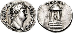 ڤستا (Vesta ؛ نطق اللاتينية: []) هي إلهة عذراء of the hearth, home, and family in Roman religion. She was rarely depicted in human form, and was often represented by the fire of her temple in the Forum Romanum. Entry to her temple was permitted only to her priestesses, the Vestals, who tended the sacred fire at the hearth in her temple. As she was considered a guardian of the Roman people, her festival, the Vestalia (7–15 June), was regarded as one of the most important Roman holidays.[1] During the Vestalia matrons walked barefoot through the city to the sanctuary of the goddess, where they presented offerings of food. Such was Vesta's importance to Roman religion that hers was one of the last republican pagan cults still active following the rise of Christianity until it was forcibly disbanded by the Christian emperor Theodosius I in AD 391.