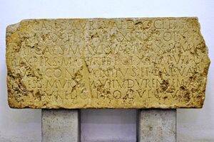 - The Emperor Gaius Aurelius Valerius Diocletian, the greatest German conqueror, the greatest Sarmatians conqueror, the greatest Persian conqueror, proclaimed in the 11th year of his tribunician power, for the tenth time as the champion, consul for the fifth time, father of the fatherland, the proconsul, the pious, happy, victorious emperor, and Valerius Constantius and Galerius Valerius Maximianus, in the illustrious reign of the emperor have built the fort wall of Vitudurum from scratch at their expense under the supervision of Aurelius Proculus, the highly respected provincial governor.[5]