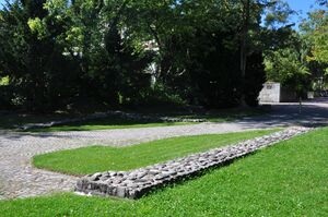 Comparable with the southwestern area, two rows of houses stretched towards the north-east. North of the church hill (Kastellweg) there were on 2،000 متر مربع (21،528 sq ft) more residential and farm buildings made of wood, but also one of stone, fresh water pipes and sewers and latrines, established in the 1st to the 3rd century AD. Fire hazard exposed buildings and imissionary trades were situated at the edges of settlement in the west and east: in the 1st and 2nd centuries at least 14 kilns and tanneries in the southwest and northeast. Individual staves of six vats, embedded in the floor of the tannery date back in the 1st century, and show bear stamp and graffiti. The numerous single finds, mostly from the 1st century, include wooden writing tablets with inscriptions, pottery fragments and a pair of shoe bars.[1]
