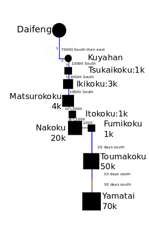 Other than the chiefdoms mentioned on the journey from Daifang to the Queen's domain in Yamatai, there are other distant countries that are only known by name. In addition, mention is made of a Kona chiefdom south of Yamatai ruled by a male king that lies outside of the Queen's control.