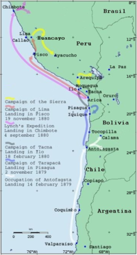 The War of the Pacific (إسپانية: Guerra del Pacífico), also known as the Saltpeter War (إسپانية: Guerra del salitre) and by multiple other names was a war between Chile and a Bolivian–Peruvian alliance. It lasted from 1879 to 1884, and was fought over Chilean claims on coastal Bolivian territory in the Atacama Desert. The war ended with victory for Chile, which gained a significant amount of resource-rich territory from Peru and Bolivia. Chile's army took Bolivia's nitrate rich coastal region and Peru was defeated by Chile's navy.[10][11]