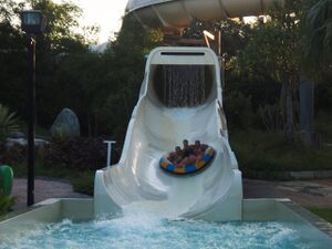 A bowl is a type of water slide where riders descend a steep drop into a round bowl. Under the effects of centrifugal force, the riders circle the outer area of the bowl before exiting down through the middle, often into a pool underneath but sometimes into an additional slide section.[19][20][21] This style of water slide comes in various styles and is manufactured by ProSlide,[22][23][24][25] WhiteWater West[26][27] and Waterfun Products.[28] The different variations can be ridden on a 4-person cloverleaf tube,[22] 2 person inline tube,[23][26] single person tube[24] or as a body slide.[25][27][28]