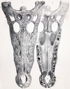 The species was named by Étienne Geoffroy Saint-Hilaire in 1807, who discovered differences between the skulls of a mummified crocodile and those of Nile crocodile (C. niloticus). This new species was, however, long afterwards regarded as a synonym of the Nile crocodile. In 2003, a study resurrected C. suchus as a valid species,[3] and this was confirmed by several other studies in 2011–2015.[5][6][7]