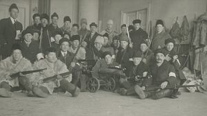 After the Civil War the function of the White Guards was unclear. In some municipalities the local White Guard was understood to be a part of the municipal administration. In others, the organisation was considered to have a primarily political role in safeguarding the result of the war.[3] The organisation was given a legal basis on August 2, 1918 by a decree of the Finnish Council of State. Changes to the decree were made later, refining the organisation's structure. From the beginning, the White Guard was considered to be a voluntary part of the Finnish military.[4]