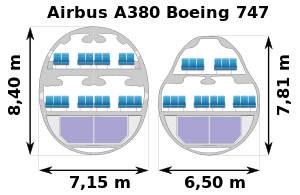 A wide-body aircraft, also known as a twin-aisle aircraft and in the largest cases as a jumbo jet, is an airliner with a fuselage wide enough to accommodate two passenger aisles with seven or more seats abreast.[1] The typical fuselage diameter is 5 إلى 6 m (16 إلى 20 ft).[2] In the typical wide-body economy cabin, passengers are seated seven to ten abreast,[3] allowing a total capacity of 200 to 850[4] passengers. Seven-abreast aircraft typically seat 160 to 260 passengers, eight-abreast 250 to 380, nine- and ten-abreast 350 to 480.[5] The largest wide-body aircraft are over 6 m (20 ft) wide, and can accommodate up to eleven passengers abreast in high-density configurations.