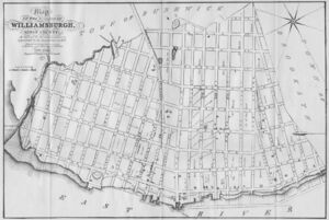 وليامزبرگ/وليامزبرغ Williamsburg هي حي سكني في قسم بروكلن بمدينة نيويورك، ويحده Greenpoint to the north; Bedford–Stuyvesant to the south; Bushwick and East Williamsburg to the east; and the East River to the west. It was an independent city until 1855, when it was annexed by Brooklyn; around that time, the spelling was changed from Williamsburgh (with an "h") to Williamsburg.[6]
