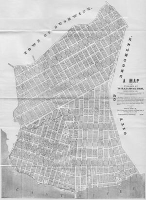 On April 18, 1835, the Village of Williamsburg annexed a portion of the Town of Bushwick. The Village then consisted of three districts. The first district was commonly called the "South Side", the second district was called the "North Side", and the third district was called the "New Village".[25] The names "North Side" and "South Side" remain in common usage today, but the name for the Third District has changed often. The New Village became populated by Germans, and for a time was known by the sobriquet of "Dutchtown".[25] In 1845, the population of Williamsburgh was 11,500.[26]