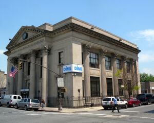 The population was at first heavily German, but many Jews from the Lower East side of Manhattan came to the area after the completion of the Williamsburg Bridge in 1903. Williamsburg had two major community banks: the Williamsburgh Savings Bank at 175 Broadway (chartered 1851, since absorbed by HSBC); and its rival, the Dime Savings Bank of Williamsburgh one block west (chartered 1864, now known as the DIME, has remained independent). The area around the Peter Luger Steak House, established in 1887, in the predominantly German neighborhood under the Williamsburg Bridge, was a major banking hub, until the City of Brooklyn united with New York City.[32] One of the early high schools in Brooklyn, the Eastern District High School, opened here in February 1900.[33][34]