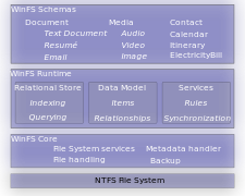 WinFS يقوم على فكرة ربط [قواعد البيانات العلائقية] وObjects وXML والوثائق الغير مهيكلة في نظام الملفات بمفهوم الـMeta-Data وذلك على الملفات طبعاً. حيث لا يتم تمثيل الملف بالطرق التقليدية عن طريق مسار الملف واسم الملف (Directory Path & File Name)و لكن تقوم بتمثيلها فردياً وذلك حسب مجال الكائنات مثل: ملفات الصور - ملفات البريد الإلكتروني - ملفات النصوص وغيرها من أنواع الملفات حيث يقوم بفهرستها كما يعطي إمكانية البحث بادق التفاصيل وذلك لأنه تم حفظ بيانات الملف وتفاصيله في قاعدة البيانات. الـ WinFS تزودنا بإمكانية الوصول إلى البيانات بالطريقتين التقليدية والحديثة أو ما يسمى API's Based والطريقة Object Based والأخيرة هي التي تستغل المزايا الجديدة.