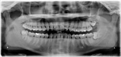 The upper left (picture right) and upper right (picture left) wisdom tooth are distoangularly impacted. The lower left wisdom tooth is horizontally impacted. The lower right wisdom tooth is vertically impacted (unidentifiable in orthopantomogram).