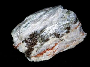 Wollastonite may also be produced in a diffusion reaction in skarn, it develops when limestone within a sandstone is metamorphosed by a dike, which results in the formation of wollastonite in the sandstone as a result of outward migration of Ca.[13]