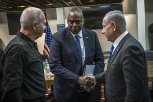 گالانت ورئيس الوزراء الإسرائيلي بنيامين نتنياهو ووزير الدفاع الأمريكي لويد أوستن في تل أبيب، 13 أكتوبر 2023.
