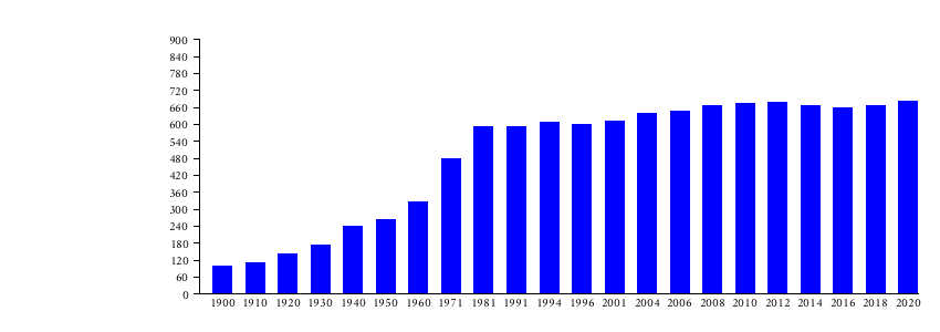 On 1 January 2021 the population of the municipality of Zaragoza was 675,301,[1] (the fifth most populated in Spain) on a land area of 973.78 متر كيلومربع (375.98 ميل مربع). The population of the metropolitan area was estimated in 2006 at 783,763 inhabitants. The municipality is home to more than 50 percent of the Aragonese population. The city lies at an elevation of about 208 متر (682 أقدام) above sea level.